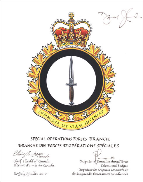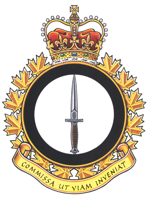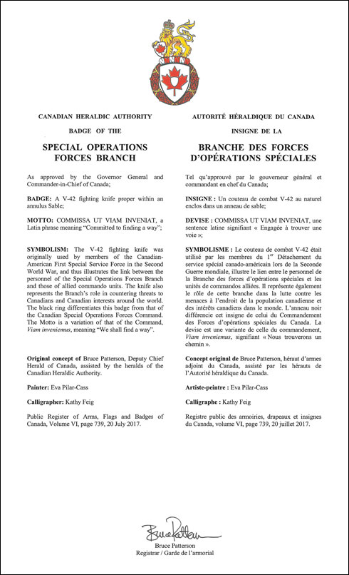 Badge of the Special Operations Forces BranchBlazonA V-42 fighting knife proper within an annulus Sable; SymbolismThe V-42 fighting knife was originally used by members of the Canadian-American First Special Service Force in the Second World War, and thus illustrates the link between the personnel of the Special Operations Forces Branch and those of allied commando units. The knife also represents the Branch’s role in countering threats to Canadians and Canadian interests around the world. The black ring differentiates this badge from that of the Canadian Special Operations Forces Command. |