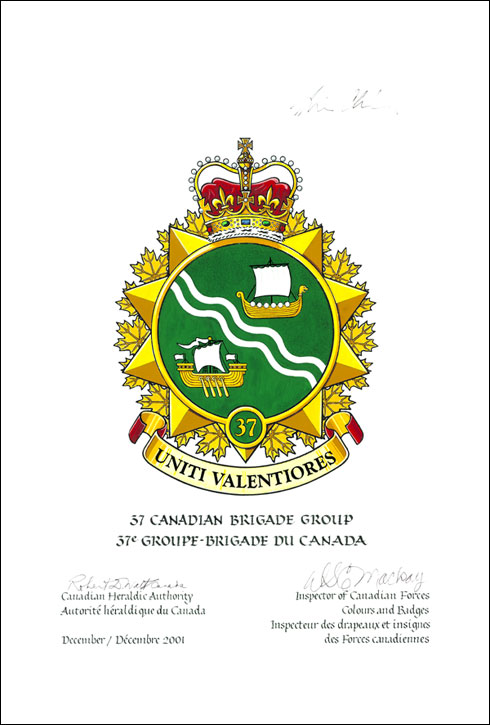 Badge of the 37 Canadian Brigade GroupBlazonVert two bendlets wavy Argent between in chief a Viking long ship Or shields and sail Argent and in base a lymphad oars in action Or sail and pennons Argent; SymbolismThe badge represents both of the provinces in the Brigade's area of responsibility. New Brunswick is symbolized by the galley from the provincial arms, while Newfoundland is represented by the Viking long ship. The wavy lines symbolize the sea between the two provinces. The green indicates that the Brigade is a land based unit. |
