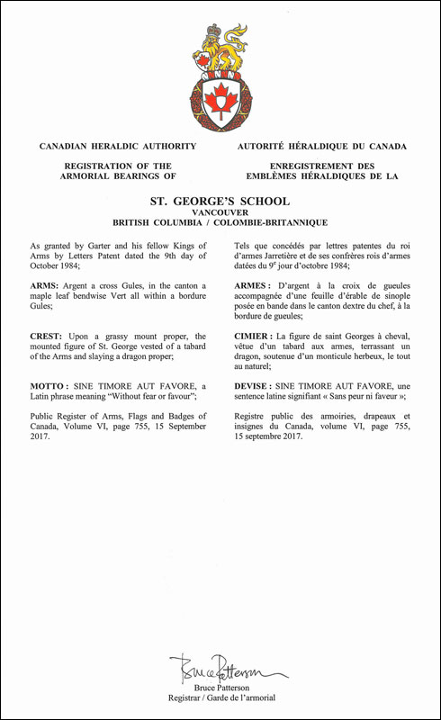 Arms of St. George’s SchoolBlazonArgent a cross Gules, in the canton a maple leaf bendwise Vert all within a bordure Gules; SymbolismThe red cross on a white background is the traditional symbol of St. George. The maple leaf identifies the school as a Canadian institution. |