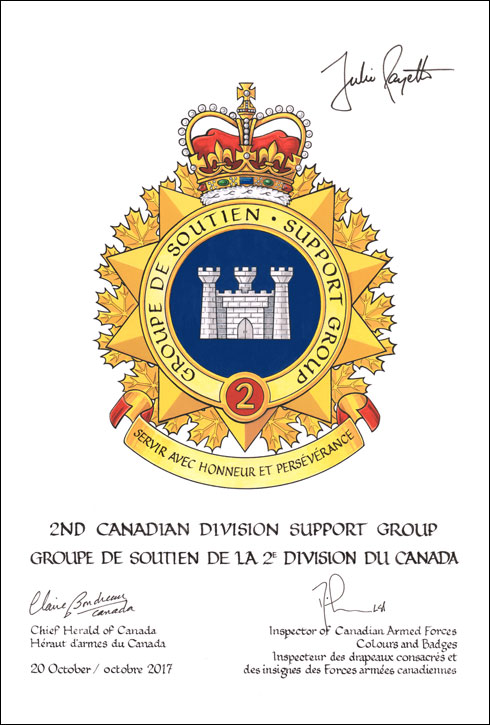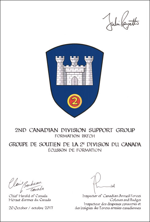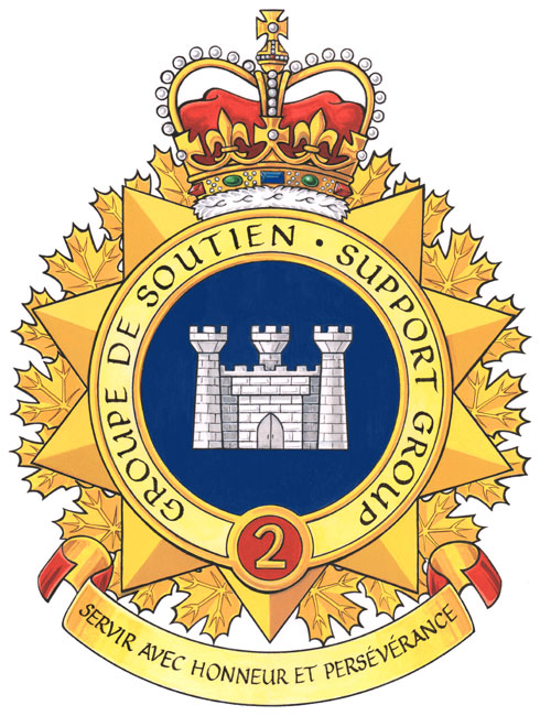 Badge of the 2nd Canadian Division Support GroupBlazonAzure a castle Argent, within the Support Group Badge Frame (An annulus Or inscribed GROUPE DE SOUTIEN • SUPPORT GROUP in letters Sable, charged in base with a torteau bordered and set with the group’s number Or, ensigned by the Royal Crown proper, environed by nine points surmounting a wreath of maple leaves Or, and above a scroll proper inscribed with the Motto in letters Sable); SymbolismBlue is the colour of the 2nd Canadian Division. The castle and the motto are taken from the badge of the 5 Area Support Group, the predecessor unit. The three towers of the castle symbolize the support group units, located in Valcartier, Saint-Jean and Montreal. |