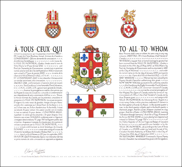 Additional InformationCreator(s)Original concept of the Ville de Montréal (1833 and 1938) and of Claire Boudreau, Chief Herald of Canada (2017), following the proposal of the indigenous committee of the Assembly of First Nations of Quebec and Labrador. PainterRobert Grey CalligrapherYolande Lessard Recipient TypeCivil Institution