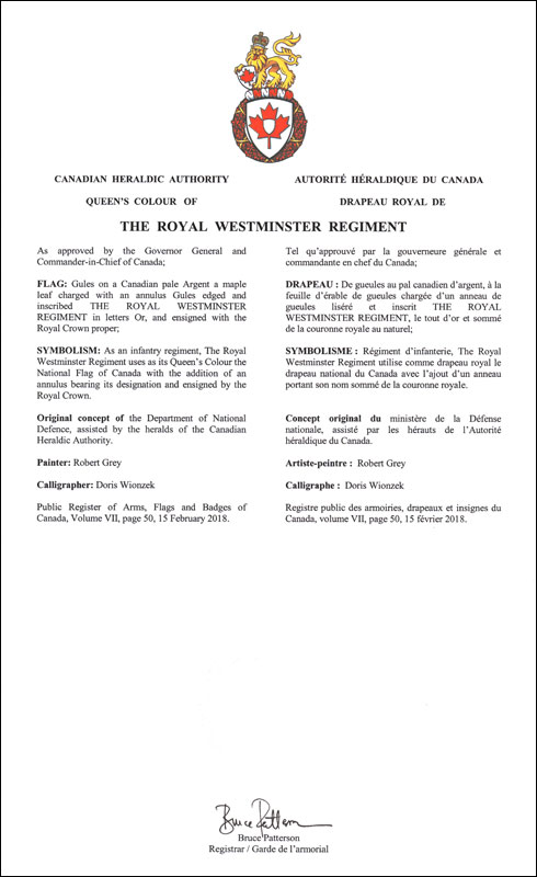 Flag of the The Royal Westminster RegimentBlazonGules on a Canadian pale Argent a maple leaf charged with an annulus Gules edged and inscribed THE ROYAL WESTMINSTER REGIMENT in letters Or, and ensigned with the Royal Crown proper; SymbolismAs an infantry regiment, The Royal Westminster Regiment uses as its Queen’s Colour the National Flag of Canada with the addition of an annulus bearing its designation and ensigned by the Royal Crown. |