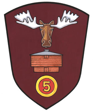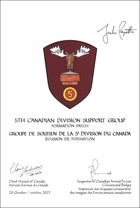 Badge of the 5th Canadian Division Support GroupBlazonMurrey a blockhouse, in chief a moose’s head caboshed proper attired Argent, within the Support Group Badge Frame (An annulus Or inscribed SUPPORT GROUP • GROUPE DE SOUTIEN in letters Sable, charged in base with a torteau bordered and set with the group’s number Or, ensigned by the Royal Crown proper, environed by nine points surmounting a wreath of maple leaves Or, and above a scroll proper inscribed with the Motto in letters Sable); SymbolismDark red is the colour of the 5th Canadian Division. The blockhouse is a distinctive historical military structure found within every province of Atlantic Canada. The moose symbolizes the wildlife of the area in which CFB Gagetown, the headquarters of the Support Group, is located. The blockhouse, moose head and motto are taken from the badge of the 3 Area Support Group, the predecessor unit. |