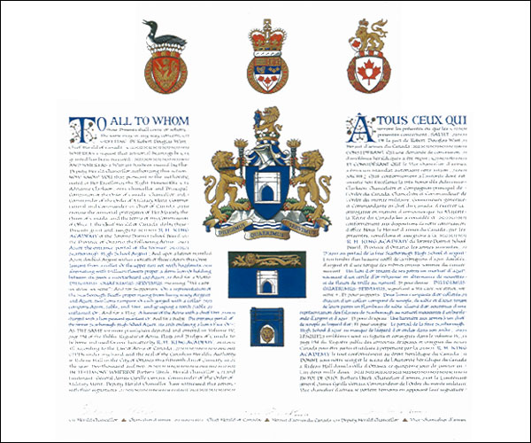 Additional InformationCreator(s)Original concept of Darrel Kennedy, Assiniboine Herald, assisted by the Heralds of the Canadian Heraldic Authority PainterDavid Farrar CalligrapherSuzzann Wright Recipient TypeCivil Institution