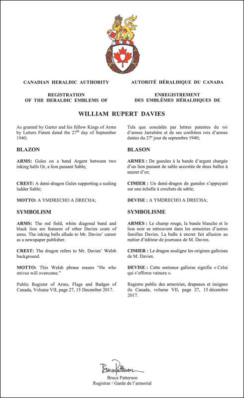 Additional InformationCreator(s)Not available PainterArtist of the College of Arms, London / Artiste du Collège d’armes, Londres CalligrapherNot applicable Recipient TypeIndividual Other InformationThe recipient’s emblems were recorded at the College of Arms, London, England, 27 September 1940. The emblems of Michel Rupert Llewellyn Davies, grandson of the recipient, are recorded in the Public Register of Arms, Flag and Badges of Canada, Vol. IV, page 291. |