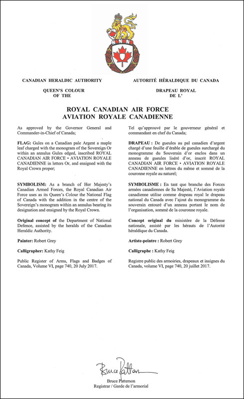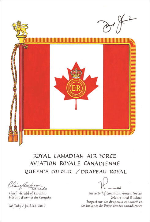 Queen's Colour of the Royal Canadian Air ForceBlazonGules on a Canadian pale Argent a maple leaf charged with the monogram of the Sovereign Or within an annulus Gules edged, inscribed ROYAL CANADIAN AIR FORCE • AVIATION ROYALE CANADIENNE in letters Or, and ensigned with the Royal Crown proper; SymbolismAs a branch of Her Majesty’s Canadian Armed Forces, the Royal Canadian Air Force uses as its Queen’s Colour the National Flag of Canada with the addition in the centre of the Sovereign’s monogram within an annulus bearing its designation and ensigned by the Royal Crown. |