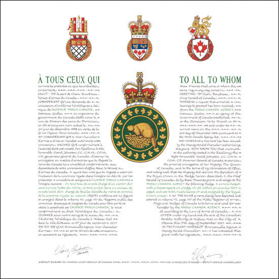 Additional InformationCreator(s)Original concept of the Parks Canada Agency, assisted by the heralds of the Canadian Heraldic Authority. PainterDebra MacGarvie CalligrapherDoris Wionzek Recipient TypeCivil Institution