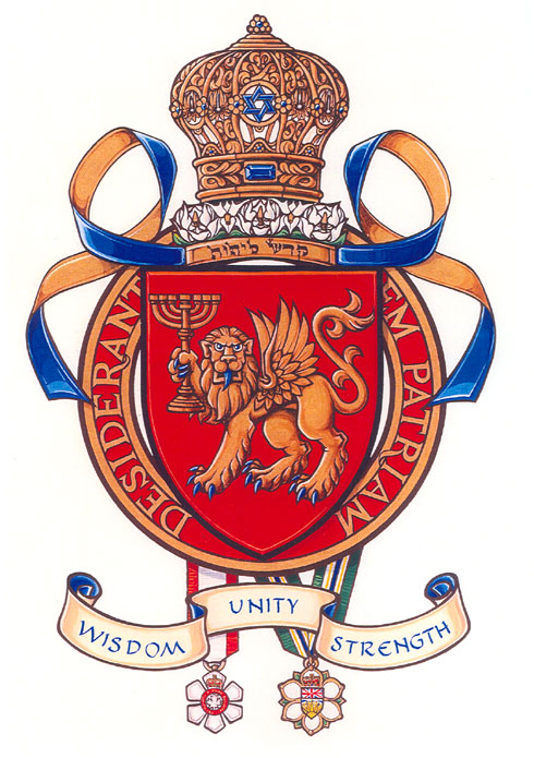 Arms of Morris Joseph WoskBlazonGules a lion passant guardant winged holding in its dexter paw a Menorah Or; SymbolismThe red and gold colours are Mr. Wosk’s choice. The lion symbolizes the lion of Judah and strength of purpose and character. The menorah honours the family and Mr. Wosk’s Jewish heritage. |