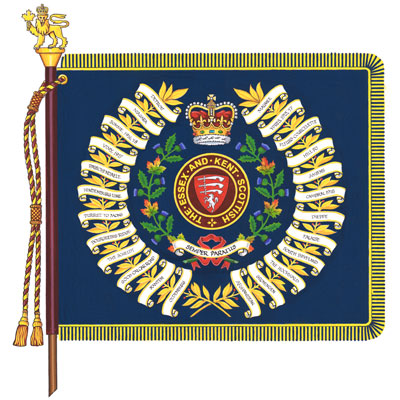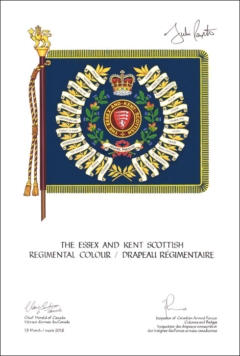 Flag of The Essex and Kent ScottishBlazon(Regimental Colour) Azure on a guze an escutcheon Gules bearing three seaxes in pale hilts to the dexter above a horse forcene Argent and encircled by an annulus Sanguine edged and inscribed THE ESSEX AND KENT SCOTTISH Or, ensigned by the Royal Crown and environed by two branches of thistles and autumnal maple leaves proper bound in base by a ribbon Gules surmounted by a scroll Argent edged Or inscribed SEMPER PARATUS in letters Sable, the whole within two laurel branches Or fructed Gules each surmounted by twelve scrolls Argent edged Or inscribed in letters Sable those to the dexter with DETROIT; NIAGARA; SOMME, 1916, ’18; VIMY, 1917; PASSCHENDAELE; HINDENBURG LINE; PURSUIT TO MONS; BOURGUEBUS RIDGE; THE SCHELDT; GOCH-CALCAR ROAD; XANTEN; OLDENBURG; those to the sinister with MAUMEE; YPRES, 1915, ’17; FLEURS-COURCELETTE; HILL 70; AMIENS; CAMBRAI, 1918; DIEPPE; FALAISE; SOUTH BEVELAND; THE HOCHWALD; GRONINGEN; AFGHANISTAN; SymbolismThe maple leaves and Royal Crown represent service to Canada and to the Sovereign. The thistles are common devices among badges of highland infantry regiments. The three seaxes refer to the arms of Essex County, England, and the white horse is from the arms of Kent County, England, these counties being the locations of the regiment’s former allied regiments The Essex Regiment and The Queen’s Own Royal West Kent Regiment. SEMPER PARATUS, a Latin phrase meaning “Always ready,” is the regiment’s motto. The scrolls record the battle honours given to the regiment. |