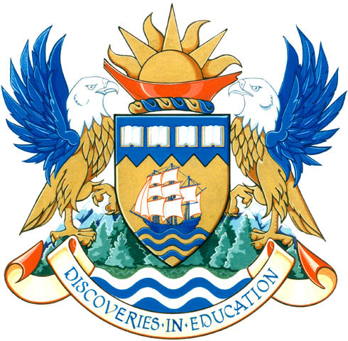 SupportersBlazonTwo eagles Or heads Argent wings elevated and addorsed Azure standing on a grassy mount set with fir trees Vert in front of mountains proper all issuant from barry wavy Argent and Azure; SymbolismThe eagles signify inspiration and striving. For the First Nations, the eagle symbolizes wisdom and power. The evergreens and lush greenery on the base are in abundance the Vancouver Island region. The mountains recall the vista accessible from all of the university’s four campuses and are unique to the western part of Canada. The alternating white and blue wavy bars refer to the presence of water at each of the campuses’ location. |