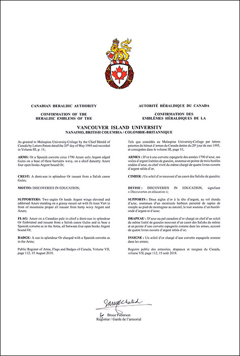 Other InformationThe recipient’s emblems were originally recorded in the name of Malaspina University-College in the Public Register of Arms, Flags and Badges of Canada, Volume III, page 11, 20 May 1995. |