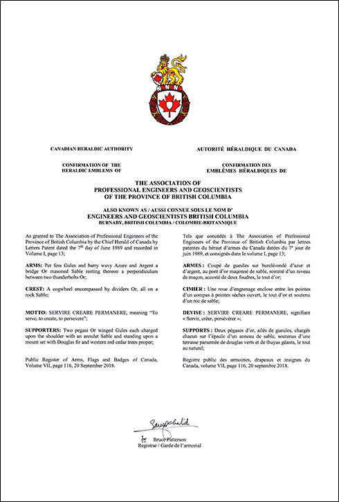 Additional InformationCreator(s)Original concept of Graham Anderson, assisted by the heralds of the Canadian Heraldic Authority. PainterJohn Whitehead CalligrapherJohn Whitehead Recipient TypeCivil Institution Other InformationThe recipient’s emblems were originally recorded in the name of The Association of Professional Engineers of the Province of British Columbia in the Public Register of Arms, Flags and Badges of Canada, Volume I, page 13, 7 June 1989. |
