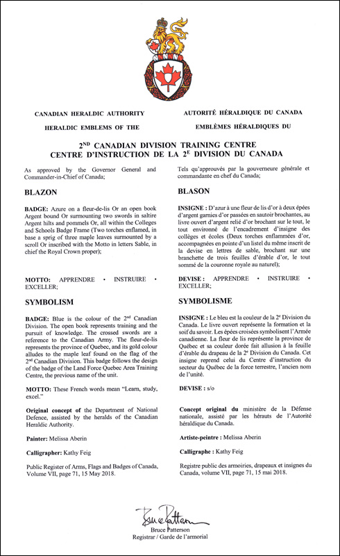 Badge of the 2nd Canadian Division Training CentreBlazonAzure on a fleur-de-lis Or an open book Argent bound Or surmounting two swords in saltire Argent hilts and pommels Or, all within the Colleges and Schools Badge Frame (Two torches enflamed, in base a sprig of three maple leaves surmounted by a scroll Or inscribed with the Motto in letters Sable, in chief the Royal Crown proper); SymbolismBlue is the colour of the 2nd Canadian Division. The open book represents training and the pursuit of knowledge. The crossed swords are a reference to the Canadian Army. The fleur-de-lis represents the province of Quebec, and its gold colour alludes to the maple leaf found on the flag of the 2nd Canadian Division. This badge follows the design of the badge of the Land Force Quebec Area Training Centre, the previous name of the unit. |