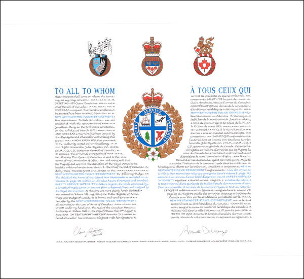 Additional InformationCreator(s)Original concept of the New Westminster Police Department, assisted by the heralds of the Canadian Heraldic Authority. PainterD. Robert Tunstall CalligrapherDoris Wionzek Recipient TypeCivil Institution