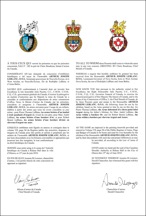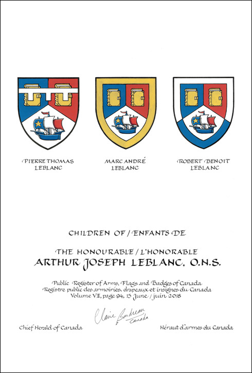 Differenced Arms for Pierre Thomas LeBlanc, child of Arthur Joseph LeBlancBlazonThe Arms of Arthur Joseph LeBlanc debruised of a three-point label Argent; This individual will inherit the Arms of the Recipient following his death; SymbolismThe colours are taken from the Acadian flag to mark the fact that Mr. LeBlanc’s father is the first Lieutenant-Governor of Nova Scotia of Acadian descent and the first francophone since 1713. The ship’s sails are in the form of the Acadian flag. The ship honours the family’s mariner ancestors, and is also a symbol of Acadia and of New Brunswick, the birthplace of Mr. LeBlanc’s mother. The books symbolize Mr. LeBlanc’s parents’ commitment to education and the arts. The label indicates that Mr. LeBlanc is the eldest child and will inherit the full arms. |