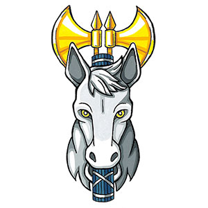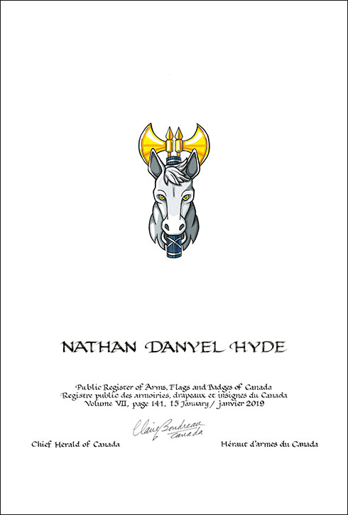 Badge of Nathan Danyel HydeBlazonA horse’s head affronty proper jessant of a fasces Azure of two blades addorsed Or; SymbolismThe horse refers to Mr. Hyde’s birth in the Chinese year of the horse. The Roman fasces allude to Mr. Hyde’s training as a lawyer. They were also a symbol of civil authority in ancient Rome, and thus symbolizes Mr. Hyde’s work in municipal government. |