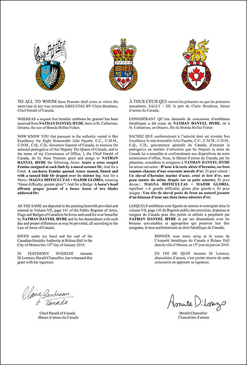 The contents of this Register are intended for research purposes only. The heraldic emblems found in the Register may not be reproduced in any form or in any media without the written consent of the Canadian Heraldic Authority and/or the recipient.