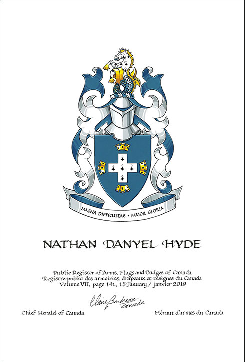 Arms of Nathan Danyel HydeBlazonAzure a cross couped Ermine ensigned at each limb by a mural coronet Or; SymbolismThe cross is indicative of Mr. Hyde’s faith and the importance it plays in his life. The fur of the cross relates to the hide in the crest. The mural coronets are symbolic of Mr. Hyde’s long service in municipal governments. |