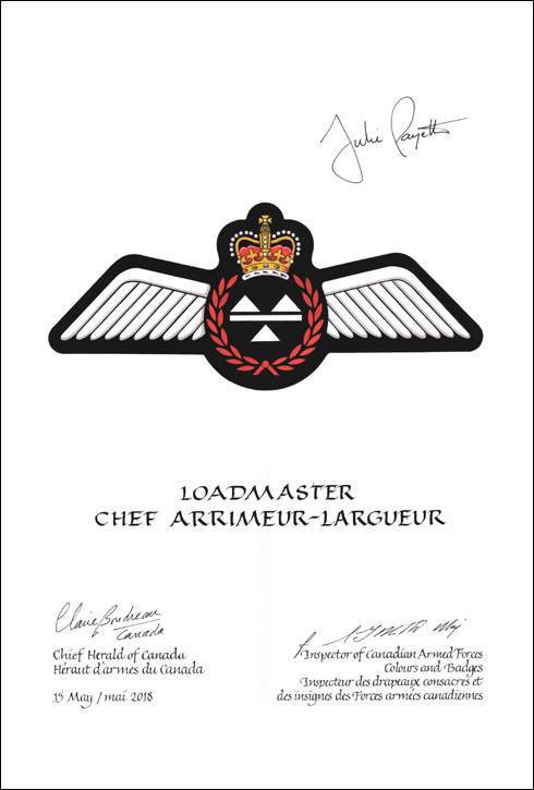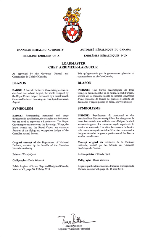 Badge of a Loadmaster of the Canadian Armed ForcesBlazonA barrulet between three triangles two in chief and one in base Argent, the whole ensigned by the Royal Crown proper, environed by a laurel wreath Gules and between two wings in fess, tips downwards Argent; SymbolismRepresenting personnel and cargo distributed in equilibrium, the triangles and horizontal bar are used to represent a Loadmaster. The Royal Crown represents service to the Sovereign. Wings, the laurel wreath and the Royal Crown are common features of the flying and occupation badges of the Canadian Armed Forces. |