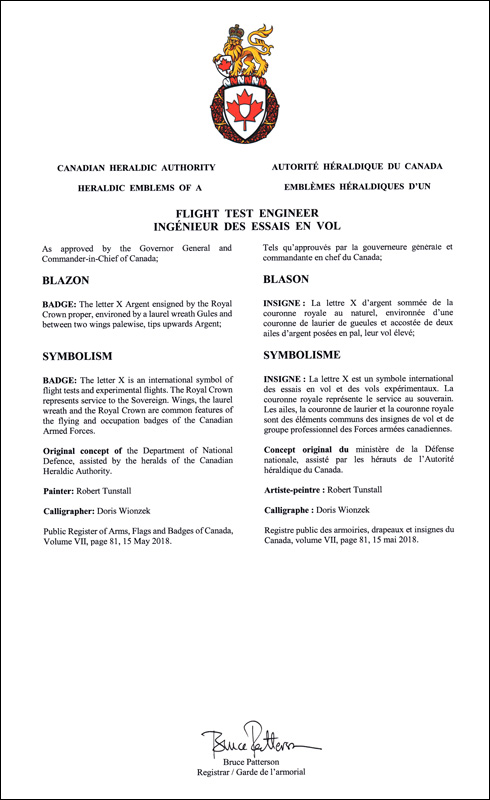 Badge of a Flight Test Engineer of the Canadian Armed ForcesBlazonThe letter X Argent ensigned by the Royal Crown proper, environed by a laurel wreath Gules and between two wings palewise, tips upwards Argent; SymbolismThe letter X is an international symbol of flight tests and experimental flights. The Royal Crown represents service to the Sovereign. Wings, the laurel wreath and the Royal Crown are common features of the flying and occupation badges of the Canadian Armed Forces. |