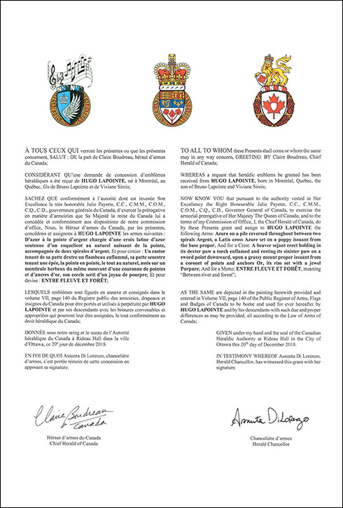 MottoBlazonENTRE FLEUVE ET FORÊT; SymbolismThis French phrase, meaning “Between river and forest,” refers to Mr. Lapointe’s love of the St. Lawrence River and nature, while alluding to the landscape surrounding the cities of Montréal and Matane. |