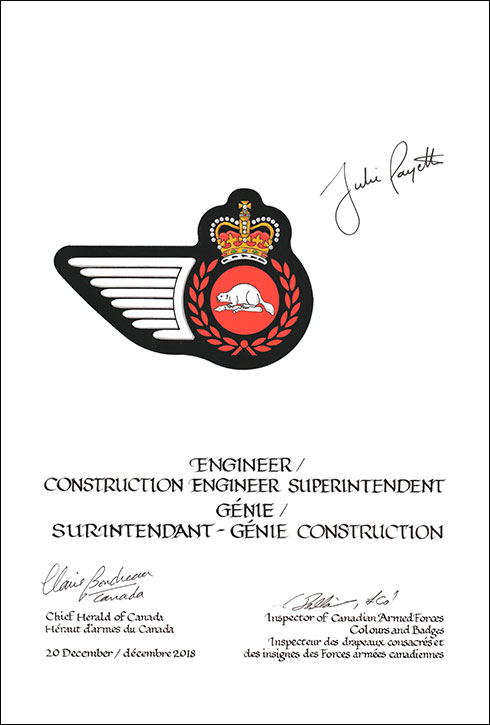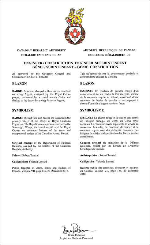 Badge of an Engineer / Construction Engineer Superintendent of the Canadian Armed ForcesBlazonA torteau charged with a beaver couchant on a log Argent, ensigned by the Royal Crown proper, environed by a laurel wreath Gules and flanked to the dexter by a wing fesswise Argent; SymbolismThe red field and beaver are taken from the primary badge of the Corps of Royal Canadian Engineers. The Royal Crown represents service to the Sovereign. Wings, the laurel wreath and the Royal Crown are common features of the trade and occupational badges of the Canadian Armed Forces. |