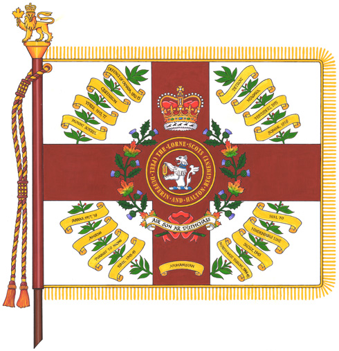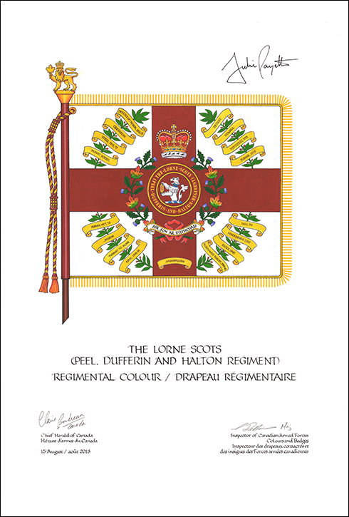 Flag of The Lorne Scots (Peel, Dufferin and Halton Regiment)Blazon(Regimental Colour) Argent a torteau charged with a demi-lion Argent issuant from a torse Argent and Azure, gorged with a collar Azure charged with a frieze of bezants, and holding between its paws a shuttle Or, all within an annulus Gules edged and inscribed THE LORNE SCOTS (PEEL DUFFERIN AND HALTON REGIMENT) in letters Or, environed by two branches of autumnal maple leaves and thistles their stems in saltire proper tied by a ribbon Gules surmounted by a scroll Argent edged Or and inscribed AIR SON AR DÙTHCHAIS in letters Sable, and ensigned by the Royal Crown proper; the whole overall a cross Gules bearing in base a scroll Or inscribed AFGHANISTAN in letters Sable and surmounting two branches of laurel Vert fructed Gules bearing scrolls Or inscribed in letters Sable, those to the dexter with DEFENCE OF CANADA, 1812-15; QUEENSTON; YPRES, 1915, ’17; MOUNT SORREL; ARRAS, 1917, ’18; AMIENS; PURSUIT TO MONS; ITALY, 1943-45; and those to the sinister with DETROIT; NIAGARA; FESTUBERT, 1915; SOMME, 1916; HILL 70; HINDENBURG LINE; SICILY, 1943; NORTH-WEST EUROPE, 1944-45; SymbolismThe central device is a form of the regimental badge. The red cross on white is a feature of a regimental colour for infantry regiments whose uniforms have white facings. The laurel branches are symbols of victory. The scrolls display select battle honours awarded to the regiment. The maple leaves represent service to Canada, and the crown, service to the Sovereign. The thistles are common devices among badges of Canadian highland infantry regiments. The motto is a Scots Gaelic phrase used by The Lorne Scots to mean “For our heritage,” incorporating the connotations of native land, hereditary landholdings, and heredity. |