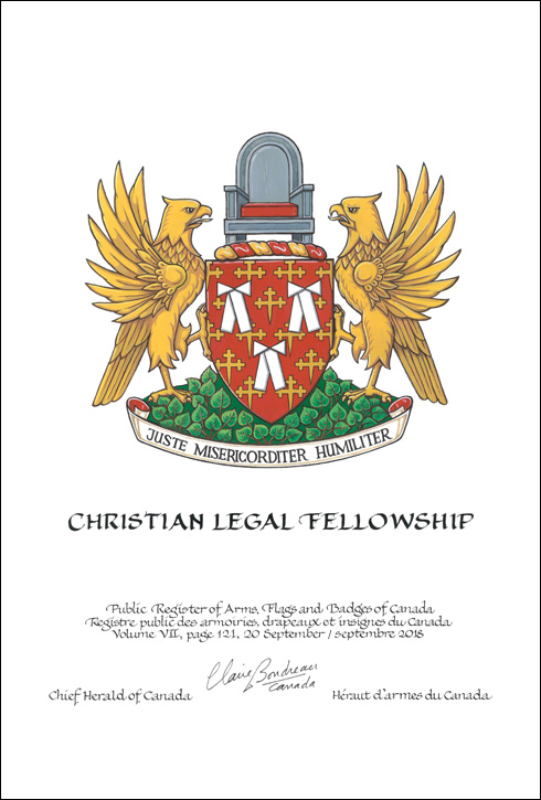 Badge of the Christian Legal FellowshipBlazonA torteau charged with a balance its finial a Latin cross Argent, all within a belt Gules edged, buckled and inscribed with the Motto, its tip Argent adorned with a maple leaf Gules; SymbolismThe cross and balance symbolize a foundation of faith and the occupation of law. The belt represents the belt of truth in Ephesians 6:14, “Stand therefore, having fastened on the belt of truth,” and the centrality of truth to justice. |