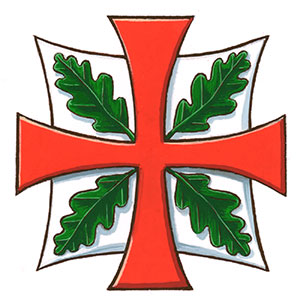 Arms of St. Jude’s Anglican ChurchBlazonGules a ship Argent its sail charged with a cross patté Gules, on a chief embattled Argent a fountain between two oak leaves Vert; SymbolismThe ship is a traditional symbol of St. Jude, representative of his travels, and has been used by the parish in various forms, including with a cross set on the sail. Red is often used with the arms of martyr saints, and here it also refers to the red brick of the church building. The crenellated line alludes to the church’s tower. The oak leaves create a canting reference to Oakville. The disc with wavy lines, a heraldic charge called a “fountain,” refers to the sacrament of baptism and to the church’s location close to Lake Ontario. |