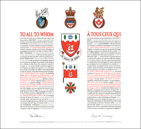 Additional InformationCreator(s)Original concept of Bruce Patterson, Deputy Chief Herald of Canada, assisted by the heralds of the Canadian Heraldic Authority. PainterKatherine Golightly CalligrapherYolande Lessard Recipient TypeCivil Institution |