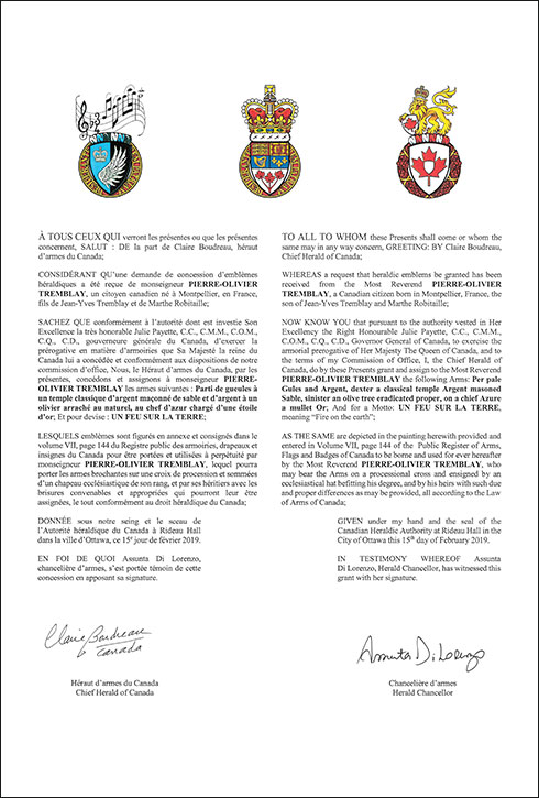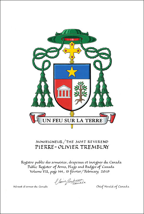 Arms of Pierre-Olivier TremblayBlazonPer pale Gules and Argent, dexter a classical temple Argent masoned Sable, sinister an olive tree eradicated proper, on a chief Azure a mullet Or; SymbolismThe blue colour of the chief and the gold star, traditional symbols of the Blessed Virgin Mary, indicate that Bishop Tremblay belongs to the congregation of the Missionary Oblates of Mary Immaculate and his relationship with the Marian sanctuary of Our Lady of the Cape Shrine, in Trois-Rivières, where he was ordained as a bishop. The red alludes to the fire mentioned in his motto. The classical temple symbolizes the Church as a temple of wisdom. Its simple form also evokes the university, a place of study and of searching for the truth, particularly in theology. The two symbols, the temple and the olive tree, evoke the Church as a structure and as a living organism. They also make a reference to Bishop Tremblay’s first name, Pierre-Olivier, which means “stone” and “olive tree” in French. |