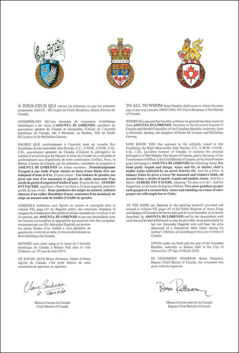 Arms of Assunta Di LorenzoBlazonPer bend grady Argent and chequy Azure and Or, in sinister chief a mullet Azure encircled by an arrow fesswise Or; SymbolismThe staircase represents leadership and the idea of moving toward the summit. Its steps represent stages, challenges overcome and successive achievements. The chequerboard pattern symbolizes strategic decisions and planning. It conveys a mosaic of clients, people and work teams united in purpose. It illustrates the people in our personal network who surround us, family members and friends. The star symbolizes leadership and success and represents multiple ongoing projects, aspirations and dreams. The star is also a very old symbol of Italy, Mtre Di Lorenzo’s ancestral homeland. The gold ring represents the international aspect of her education and the international work she has done in every post she has held throughout her career. |