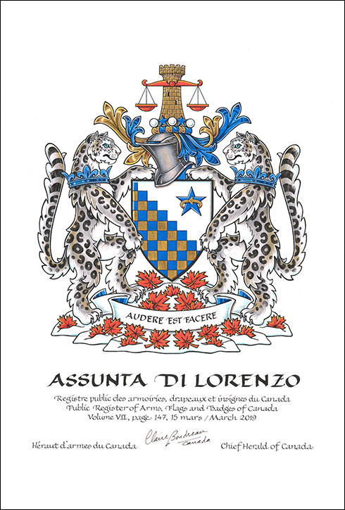 Additional InformationCreator(s)Original concept of Claire Boudreau, Chief Herald of Canada, assisted by the heralds of the Canadian Heraldic Authority. PainterCathy Bursey-Sabourin CalligrapherDoris Wionzek Recipient TypeIndividual |