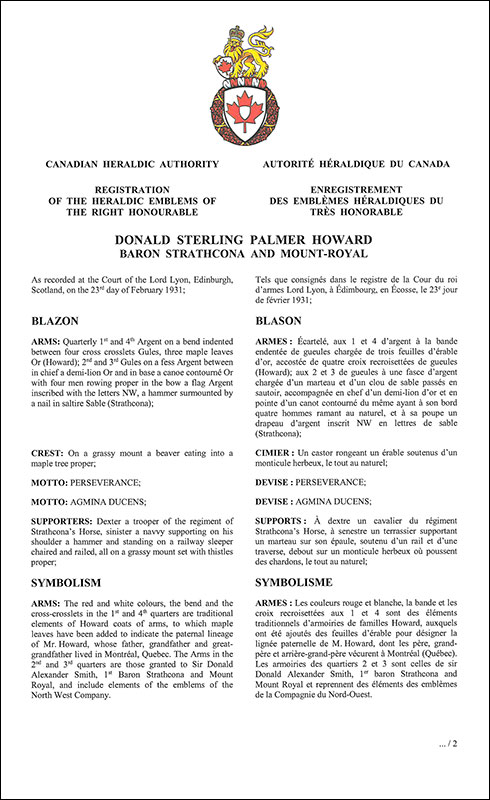 Additional InformationCreator(s)Not available. PainterNot applicable CalligrapherNot applicable Recipient TypeIndividual Other InformationThe recipient’s emblems were originally recorded in the records of the Court of the Lord Lyon, Edinburgh, Scotland, 23 February 1931. See also the heraldic emblems of Donald Alexander Smith (Vol. VI, p. 300), Lord Strathcona’s Horse (Royal Canadians) (Vol. IV, p. 436) and Strathcona County, Alberta (Vol. VI, p. 485). |