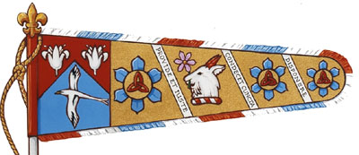 Flag of Colin Alistair Mecum FlemingBlazonA standard, the Arms in hoist the fly Or charged with the Crest between three representations of the Badge, one to the dexter, two to the sinister, all separated by three bends Argent inscribed with the Motto in letters Sable; SymbolismThe symbolism of this emblem is found in other element(s) of this record. |