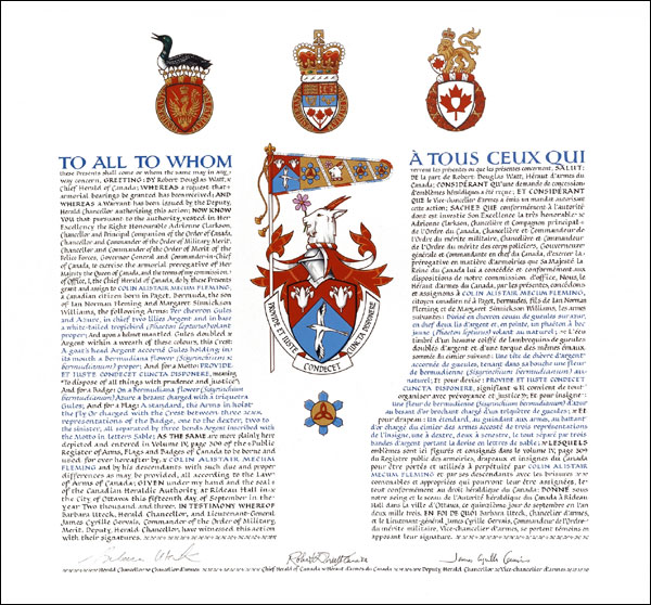 Arms of Colin Alistair Mecum FlemingBlazonPer chevron Gules and Azure, in chief two lilies Argent and in base a white-tailed tropicbird (Phaeton lepturus) volant proper; SymbolismRed is a favourite colour of Mr. Fleming’s, and blue represents the waters around his birthplace of Bermuda. Blue and red are also the colours of the Bermuda Regiment, in which Mr. Fleming performed his military service. The longtail tropic bird is associated with Bermuda, and the flowers have several meanings. First, they can represent Bermuda Easter lilies. Second, they can represent garden lilies, a symbol of Quebec, from where Mr. Fleming’s parents originated. Finally, as a traditional symbol of the Blessed Virgin Mary, the lily makes a reference to Mr. Fleming’s Christian faith. |