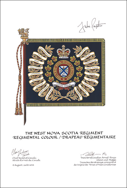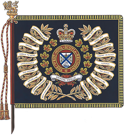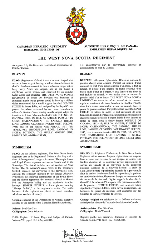 Regimental Colour of The West Nova Scotia RegimentBlazon(Regimental Colour) Azure a torteau charged with an escutcheon Argent bearing a saltire Azure between in chief a church on a mount, in base a schooner proper set on barry wavy Azure and Argent, and in the flanks a mayflower leaved proper, and encircled by an annulus Gules edged and inscribed THE WEST NOVA SCOTIA REGIMENT in letters Or, between two branches of autumnal maple leaves proper bound in base by a ribbon Gules surmounted by a scroll Argent inscribed SEMPER FIDELIS in letters Sable, and ensigned by the Royal Crown proper, the whole environed by two laurel branches in saltire Or fructed Gules bearing scrolls Argent edged Or inscribed in letters Sable on the dexter with DEFENCE OF CANADA, 1812 - 15; HILL 70; AMIENS; PURSUIT TO MONS; CATENANUOVA; THE SANGRO; HITLER LINE; LAMONE CROSSING; NORTH-WEST EUROPE, 1945; and on the sinister with ARRAS, 1917, ’18; YPRES, 1917; HINDENBURG LINE; LANDING IN SICILY; POTENZA; THE GULLY; GOTHIC LINE; RIMINI LINE; AFGHANISTAN; SymbolismAs an infantry regiment, The West Nova Scotia Regiment uses as its Regimental Colour a blue flag with a form of the regimental badge at its centre. The maple leaves and Royal Crown represent service to Canada and to the Sovereign. The shield includes several symbols of Nova Scotia. The St. Andrew’s cross refers to the province’s Scottish heritage; the mayflower is the province’s floral emblem; the schooner, inspired by the famous Bluenose, symbolizes the seafaring communities of the South Shore; and the church represents the memorial church at Grand-Pré, the Annapolis Valley and the province’s Acadian heritage. SEMPER FIDELIS, a Latin phrase meaning “Always faithful,” is the regiment’s motto. The battle honours of the regiment are placed on laurel branches, which are symbols of victory. |