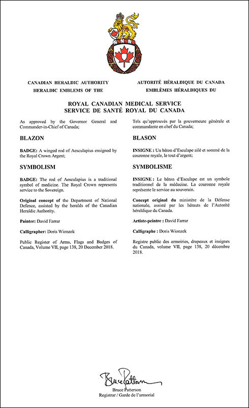 Additional InformationCreator(s)Original concept of the Department of National Defence, assisted by the heralds of the Canadian Heraldic Authority. PainterDavid Farrar CalligrapherDoris Wionzek Recipient TypeMilitary Institution Other InformationSee also the heraldic emblems approved under the names Canadian Forces Medical Services (Vol. VI, p. 199) and Royal Canadian Medical Service (Vol. VI, p. 264). |