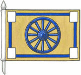 Arms of the Town of CardstonBlazonOr a carriage wheel within an orle Azure surmounted at each angle by a billet Argent; SymbolismThe gold background symbolizes the town’s agricultural success. The carriage wheel refers to the settlers’ travel by wagon train, and also to the town’s Remington Carriage Museum. The blue band and white rectangles represents the water of Lee Creek used in irrigation canals and the communities serviced by the said canals. As well, the rectangles evoke playing cards, and thus represent the Card family, the leading family of the original settlers, and make a canting reference to the town’s name. |