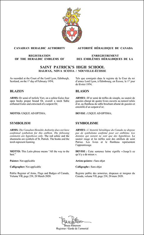 Arms of Saint Patrick's High SchoolBlazonOr semé of trefoils Vert, on a saltire Gules four open books proper bound Or, overall a torch Sable enflamed Gules and entwined of a serpent Or; SymbolismThe Canadian Heraldic Authority does not have confirmed symbolism for this emblem. The following comments are hypotheses only. The red saltire and the shamrocks are symbols of St. Patrick. The books and the torch represent learning. |