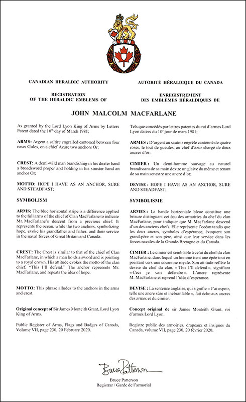 Arms of John Malcolm MacFarlaneBlazonArgent a saltire engrailed cantoned between four roses Gules, on a chief Azure two anchors Or; SymbolismThe blue horizontal stripe is a difference applied to the full arms of the chief of Clan MacFarlane to indicate Mr. MacFarlane’s descent from a previous chief. It represents the ocean, while the two anchors, symbolizing hope, evoke his grandfather and father, and their service in the naval forces of Great Britain and Canada. |