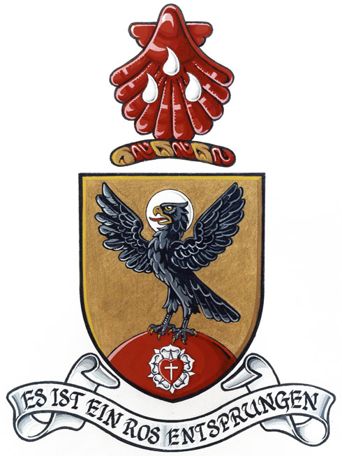 MottoBlazonES IST EIN ROS ENTSPRUNGEN; SymbolismES IST EIN ROS ENTSPRUNGEN is the first line of a famous 15th-century German Christmas carol, and its most famous English translation is “Lo how a rose e’er blooming.” It is a reference to Christ, and in this case it also refers to the rose in the arms. |