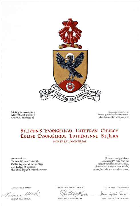 Arms of St. John's Evangelical Lutheran ChurchBlazonOr on a mound Gules charged with a Luther rose (A rose Argent seeded of a heart Gules bearing a Latin cross Argent), an eagle rising Sable nimbed Argent beaked Or; SymbolismThe black, red and gold, being the colours of Germany, refer to the parish’s historic status as the German Evangelical Church of Montreal, and the red and white are the colours of Canada. The Luther Rose is a familiar symbol of Lutheranism, and is based on an emblem used by Martin Luther himself. The eagle is the traditional symbol of St. John the Evangelist, and has thus been shown with the halo. |
