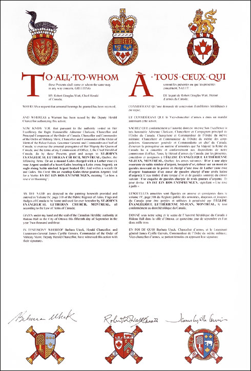 Additional InformationCreator(s)Original concept of Peter Hannen, assisted by the Heralds of the Canadian Heraldic Authority PainterGordon Macpherson CalligrapherNancy Ellis Recipient TypeCivil Institution