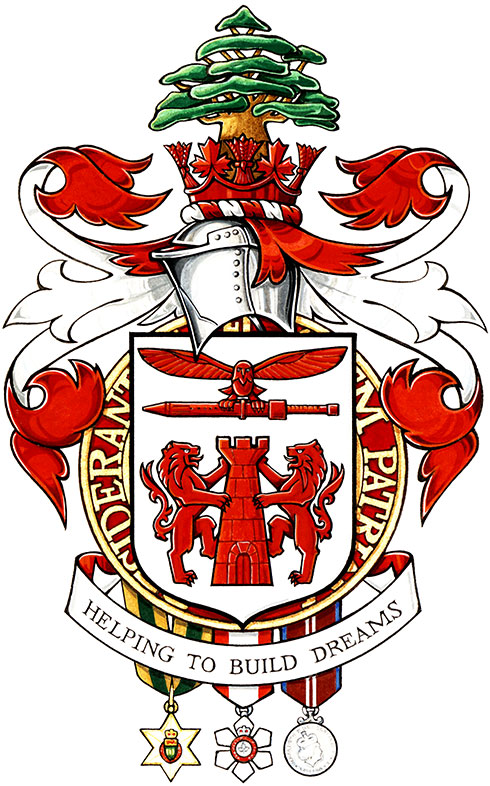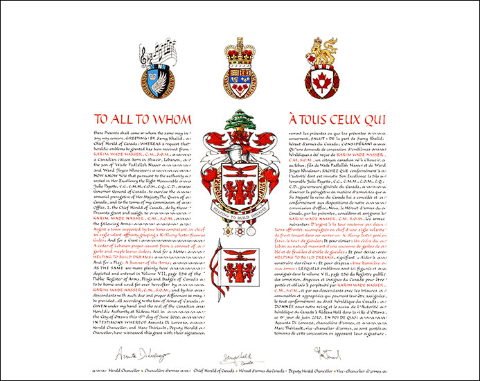 Arms of Karim Wade NasserBlazonArgent a tower supported by two lions combatant, in chief an eagle volant affronty grasping a K-Slump Tester fesswise Gules; SymbolismWhite and red are the colours of Canada and are also present on the flag of Lebanon, thus representing Dr. Nasser’s adopted and native countries respectively. The tower alludes to his career as a civil and structural engineer. It also refers to the CN Tower in Toronto; Dr. Nasser developed innovative processes for building with concrete, which were first used during the Tower’s construction. The lions are a symbol of victory, and thus refer to the name Nasser, a variant of which, nasr, means “victory” in Arabic. The red lion is also a symbol of his native village of Shweir, Lebanon. By supporting the tower, the lions allude to Dr. Nasser’s career in ensuring the safety of public infrastructure, as well as to his philanthropy and support for his community. The eagle is also a symbol of victory for Dr. Nasser, in addition to being a homophone of his name, nasir meaning “eagle” in Arabic. The K-Slump Tester is a tool developed by Dr. Nasser to test the consistency of concrete and has become an industry standard. |
