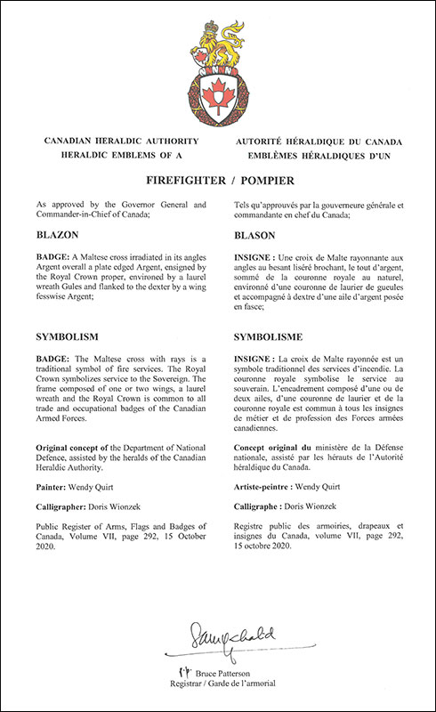 The contents of this Register are intended for research purposes only. The heraldic emblems found in the Register may not be reproduced in any form or in any media without the written consent of the Canadian Heraldic Authority and/or the recipient.