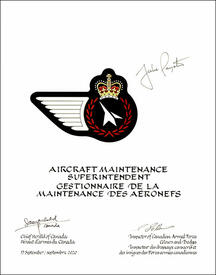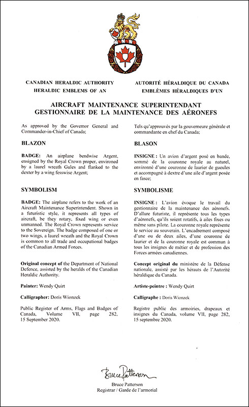 Badge of Aircraft Maintenance SuperintendentBlazonAn airplane bendwise Argent, ensigned by the Royal Crown proper, environed by a laurel wreath Gules and flanked to the dexter by a wing fesswise Argent; SymbolismThe airplane refers to the work of an Aircraft Maintenance Superintendent. Shown in a futuristic style, it represents all types of aircraft, be they rotary, fixed wing or even unmanned. The Royal Crown represents service to the Sovereign. The badge composed of one or two wings, a laurel wreath and the Royal Crown is common to all trade and occupational badges of the Canadian Armed Forces. |