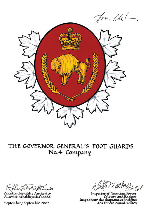 Badge of the Governor General's Foot Guards, No. 4 CompanyBlazonGules a bison statant between two stems of wheat and in chief the Royal Crown Or, the whole on a wreath of seven maple leaves Argent; SymbolismRed and white are the national colours of Canada and, together with the Royal Crown, symbolize a Canadian unit based in the National Capital, serving Canada and with an ongoing relationship to the Commander-in-Chief as Colonel of the Regiment. The number of leaves, seven, represents the number of Canadian provinces at the time of the first deployment. The bison is a historic emblem within the life of the unit. A small bronze statue of it is featured at the annual banquet commemorating the battle of Cut Knife Hill. It also represents the great western prairies which the unit crossed on its first deployment. The two ears of wheat are a reference to the Province of Saskatchewan, site of Cut Knife Hill. They allude to the two Guards members lost in the battle which took place there in 1885. |
