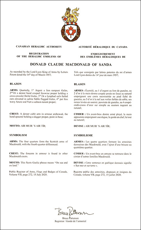 Arms of Donald Claude MacDonald of SandaBlazonQuarterly, 1st Argent a lion rampant Gules, 2nd Or a dexter hand couped fesswise proper holding a cross-crosslet fitché Gules, 3rd Or a lymphad sails furled oars elevated in saltire Sable flagged Gules, 4th per fess wavy Azure and Vert a salmon naiant proper; SymbolismThe four quarters form the Scottish arms of Macdonald, with the fourth quarter differenced. |