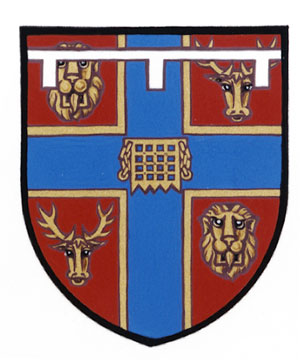 Arms of David Vernon SteevesBlazonGules a cross Azure fimbriated Or charged with a portcullis, all between in the first and fourth quarters a lion's face and in the second and third quarters a stag's head caboshed Or; SymbolismThe design refers to Mr. Steeves’ career as a customs officer and his family heritage. Blue and gold have long been associated with the customs service, as has the portcullis. The lions’ heads represent his English ancestral heritage, and the stags’ heads refer to the arms of Württemberg and thus to his German heritage. |